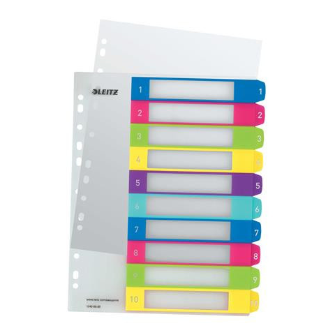 Regiszter, műanyag, A4 Maxi, 1-10, LEITZ Wow -vegyes színű regiszter -nagyméretű téglalapok az előlapon a tartalom feltüntetésére -1-10 felirattal rendelkező regiszter fülek a dokumentumok gyors eléréséhez -nyomtatható tárgymutató az egyedi igényekh