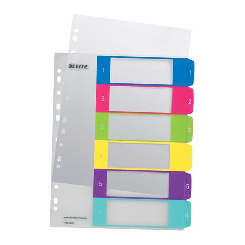 Regiszter, műanyag, A4 Maxi, 1-6, LEITZ Wow -vegyes színű regiszter -nagyméretű téglalapok az előlapon a tartalom feltüntetésére -1-6 felirattal rendelkező regiszter fülek a dokumentumok gyors eléréséhez -nyomtatható tárgymutató az egyedi igényekhez