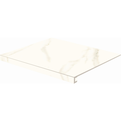 Élcsiszolt. Fagyálló. Lépcsőkő fehér színben márványutánzatban mérete 59,8x53 cm vastagsága 10 mm fényes felülettel. Beltérbe és kültérbe is alkalmas. Nagy és véletlenszerű eltérésekkel a színárnyalatban, a felületi textúrában és a rajzban. Alkalmas a konyhába, irodába.