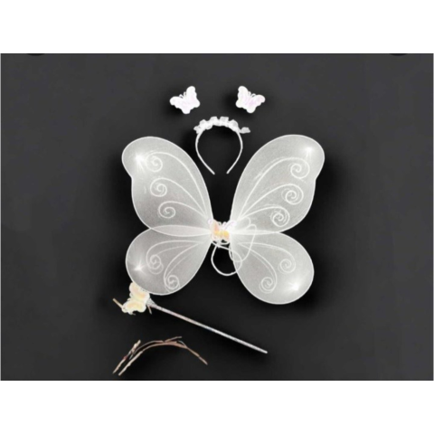 Könnyű, áttetsző pillangószárnyakból, pillangós fejpántból, varázspálcából álló szett. Tökéletes jelmez farsangra, jelmezes bulira vagy mesés játékhoz.