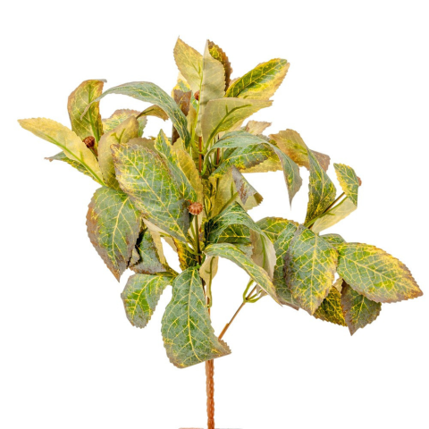 A 6 ágú leveles bokor természetes hatású, élethű zöld dekoráció, amely bármilyen kompozíciót gazdagabbá és élettel telibbé varázsol. Sokoldalúan felhasználható alapanyag koszorúk, asztaldíszek, virágkompozíciók és tálrendezések készítéséhez. A részletgazd
