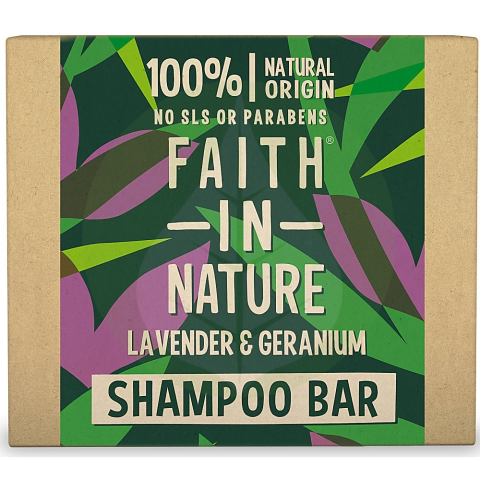 Levendula és Geránium szilárd sampon - 85g - Faith in Nature Minden hajtípusra ajánlott. Kézzel készített és vegán szilárd sampon tökéletes bárkinek, aki úgy gondoskodik a bolygóról, mint a saját hajáról. Mivel ez egy szilárd szappan állagú sampon, ide