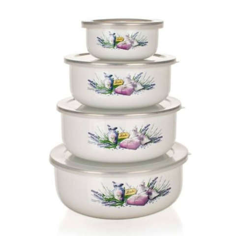 8 részes LAVENDER zománcozott tálka készlet műanyag tetővel, átmérő - 10, 14, 16 és 18 cm. A tálkák kizárólag élelmiszerek tárolására szolgálnak, főzésre nem használhatók.