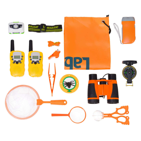 Kétszemes távcső, nagyító, rovarmegfigyelő doboz, rovarbefogó, lepkeháló, iránytű, csipesz, síp, két zseblámpa, két kézi adó-vevő (walkie-talkie), hátizsák Kétszemes távcső, nagyító, rovarmegfigyelő doboz, rovarbefogó, lepkeháló, iránytű, csipesz, síp, két zseblámpa, két kézi adó-vevő (walkie-talkie), hátizsák