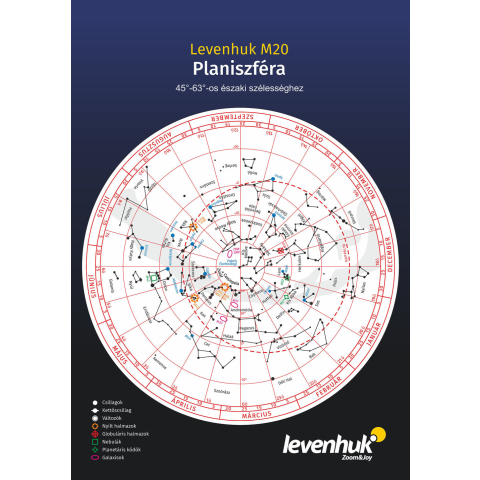 Méretek: 21x31 cm A Levenhuk M20 nagyméretű planiszféra egy forgó csillagtérkép. Egyszerű és szórakoztató módon jeleníti meg az égen lévő csillagok valós helyzetét adott napon és időpontban. Az éjjeli ég – mint tudjuk – a Föld Nap körüli és saját tenge