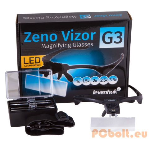 A Levenhuk Zeno Vizor G3 nagyítószemüveg beépített világítással és öt darab, minőségi optikai polimerüvegből készült, cserélhető lencsével van felszerelve. A lencsék cserélése révén 1x–3,5x-ös tartomány között összesen öt fix nagyítási érték állítható be. A LED-lámpa világos fényt ad, és a teljes munkaterületre kiterjed. A Levenhuk Zeno Vizor G3 nagyítószemüveggel még kevés külső fény esetén is továb