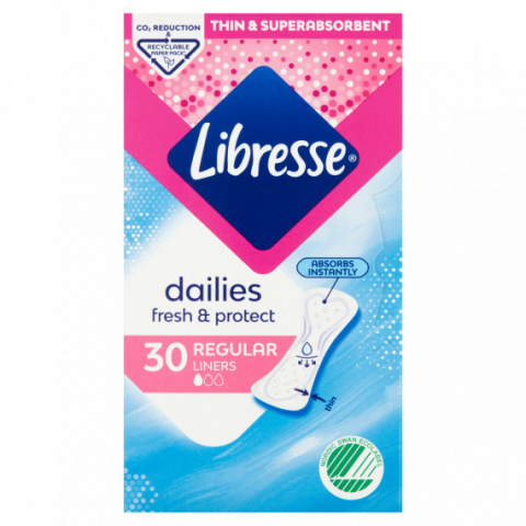 15 db/karton A Libresse Dailies Fresh Regular Liners tisztasági betét különleges kialakításával illeszkedik alakodhoz, hogy igazán kényelmes legyen. Enyhén illatosított, hogy egész nap frissnek és magabiztosnak érezd magad. Jól használható a menzes