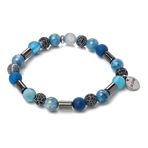 RUGALMAS KARKÖTŐ, a mérete választható.Az ékszer ásványai és tartozékai:– 8 mm-es matt kék csíkos achát gyöngyök– 8 mm-es sötétkék tűz achát gyöngyök– 8 mm-es világoskék aventurin gyöngyök– 6x8 mm-es fekete hematit henger