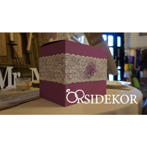 Gyűjtsétek be stílusosan és egyedi formában a násznép ajándékait! Téglalap alakú, lila színű nászajándékgyűjtő persely, a modern, letisztult elegancia stílus jegyében, nosztalgikus hangulatú csipke díszítéssel. A doboz más szí