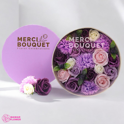 1 kép LILA RÓZSA ÉS SZEGFŰ Szappanvirág kerek doboz