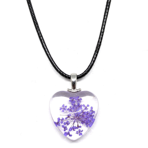 1 kép Lila virág szív üvegmedál fekete bőr nyaklánccal