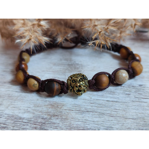 LION Tigrisszem és Kép jáspis férfi macrame karkötő LION Tigrisszem és Kép jáspis ásvány gyöngyökből készült állítható méretű férfi macrame karkötő. A gyöngyök mérete 8 mm. Oroszlán mérete1x1,4mm A karkötő mérete állítható, minimum mérete 20cm