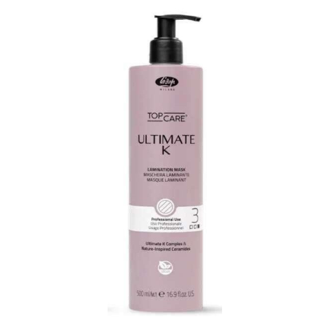 Lisap Top Care Ultimate K lamináló maszk Step 3, 500 ml - A Lisap laboratórium legújabb kutatásainak eredménye a Lisap Ultimate K termékcsalád, az innovatív, sokoldalú, vegán, rendkívül hatékony és hosszan tartó professzionális hajvasaló kezelés, vegán