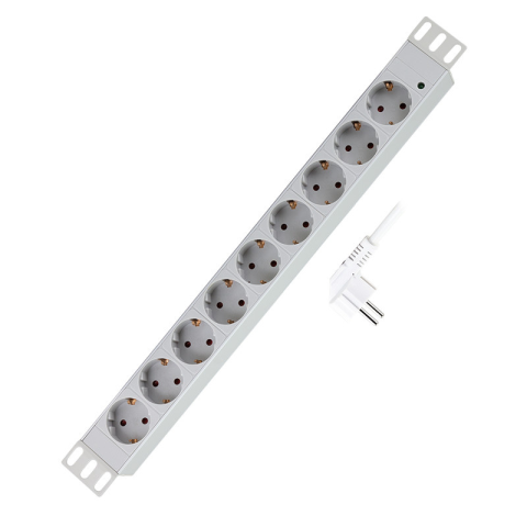 Elosztó 19-os profilkeretre szereléshez (1 U) Robusztus alumínium ház, jelzőlámpával Aljzatok: 9x biztonsági aljzat CEE 7/3, 45 -os szögben Csatlakozás: német dugó CEE 7/7, szögletes Műszaki adatok: AC 230 V /16 A, 50 Hz, max. 3600 W 2 m csatlakozókábel H