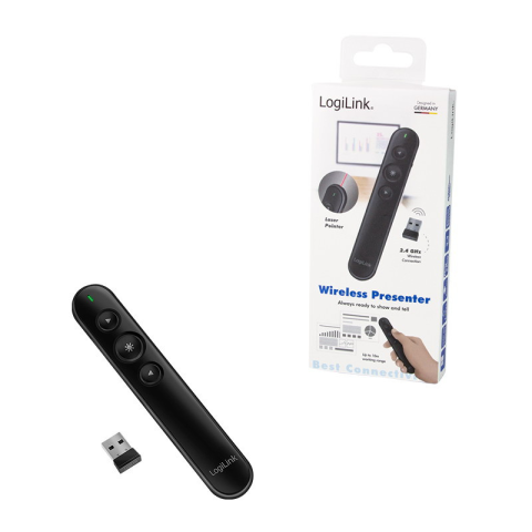 3 gombos kialakítás beépített piros lézermutatóval az intuitív kezelés és az egyszerű prezentáció érdekében Csatlakozás: 2,4 GHz-es vezeték nélküli technológia Hatótáv: 50 m-ig Gombok: Következő dia, előző dia, lézermutató Kompakt és elegáns kialakítá