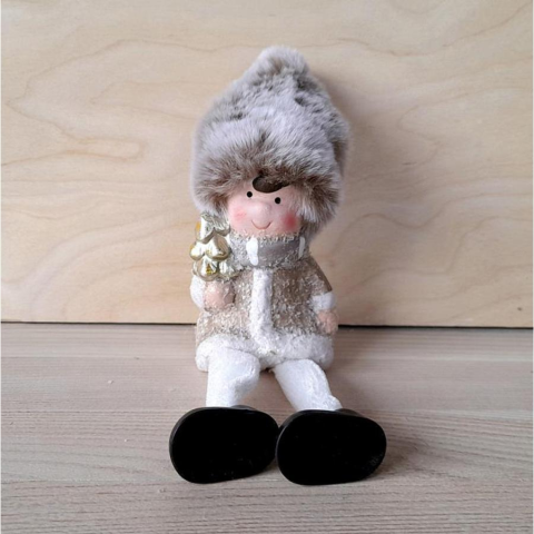Lógólábú gyerek, szürke  sapiban, fenyővel. Mérete: 8 cm. karácsonyi dekoráció 1 kép