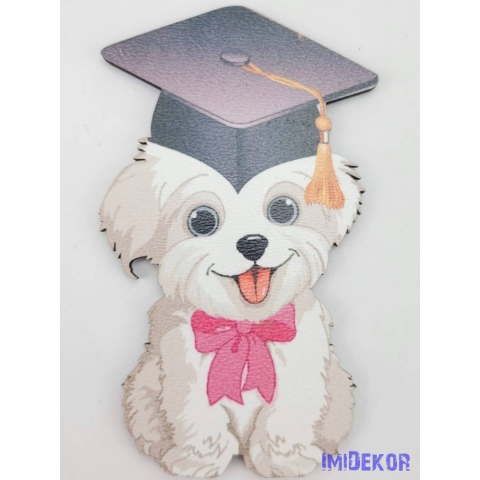 Lógónyelvű kutyus tábla rózsaszín masnis ballagó kalapban dekorációs kellék árgrafikon