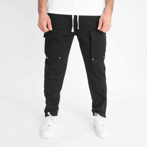 Loose Fit, bő fazon, fekete oldalzsebes nadrág, gumis derékkal és húzózsinórral, bokánál cipzárral Modell: 185 cm/85 kg/ L-es méret