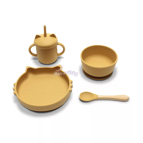 BPA- és ftalát mentes étkészlet 4 részből álló szett: 1 db etetőtál, 1 db kanál, 1 db itatópohár, 1 db tányér Könnyen tisztítható Puha természetes szilikonból készült Mikróhullámú sütőben és mosogatógépben is használható 6 hónapos