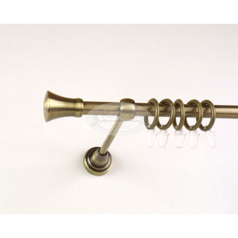 A LOS ANGELES óarany színű 300 cm-es, 1 rudas fém karnis szett tartalma: 1 db 300 cm-es óarany színű, 16 mm átmérőjű fém karnisrúd 2 db Los Angeles típusú óarany színű fém karnis végzáró 3 db falra szerelhető fém konzol 30 db óarany színű műanyag függöny