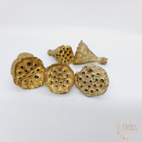 Szín: világos arany Tömeg: 7 gramm Egy csomagban 5 db száraz termés található. Lótusz száraz termés asztaldíszekhez, kopogtatókhoz, adventi koszorúkhoz. A száraz termések megtalálhatóak natúr és változatos festett színekben. Egyszerűen felragaszthatóa