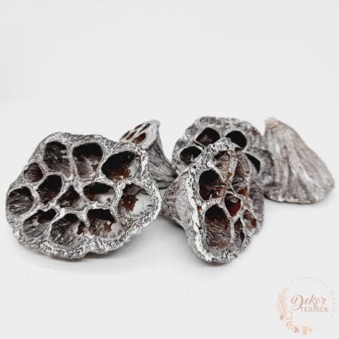 Szín: hamvas Tömeg: 18 gramm Egy csomagban 5 db száraz termés található 4-5 cm-es méretben. Lótusz száraz termés asztaldíszekhez, kopogtatókhoz, adventi koszorúkhoz. A száraz termések megtalálhatóak natúr és változatos festett színekben. Egyszerűen fe