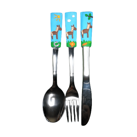 Lovas evőeszköz szettLovass szett kék alapon.A termékek alapanyaga kiváló minőségű (olasz Gnali márkájú) rozsdamentes acél evőeszköz és polymer clay, hőre keményedő lágyított műanyag díszítés.Meleg ételt italt lehet vele enni, keverni, de a 100 fokos forróvízben megpuhul a gyurma. Meleg helyen hagyhatjuk, de a forró vízben ne!Ha leesik az evőeszköz (kőre, a sarkával), eltörhet a műanyag díszítés. Nem kell rögtön kétségbe esni, kisebb sérülések, pl