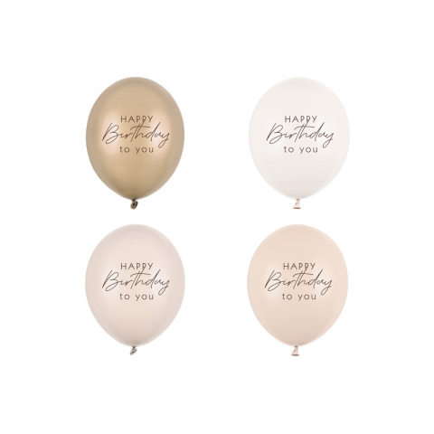 Strong balloons Happy Birthday with print, set contains 4 colours of balloons (Pastel Nude, Pastel Warm Grey, Pastel Off-white and Metallic Cold Gold) with double-sided print, diameter approx. 30 cm. (1 pkt / 50 pc.)