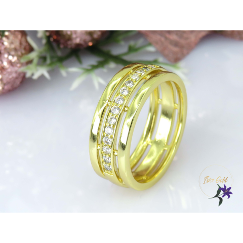 Gold Filled három soros gyűrű középen cirkóna kövek díszített . A háromrész egybe van nem szét választható .Szin: 14K Szélesség:7mm