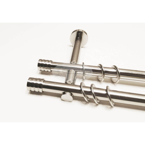 A LYON 2 rudas, 320 cm-es fém karnis szett tartalma: 4 db 19 mm átmérőjű, 160 cm hosszú fém karnisrúd (fényes inox színben) 2 db toldó elem 4 db LYON típusú fém karnis végzáró 3 db falra szerelhető fém konzol 64 db szilikon betétes fém karika (ún. csönde