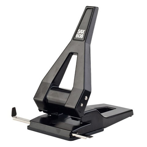 Lyukasztó SAX 608 2 lyukú fém 65 lap fekete Nagyteljesítményű karos lyukasztógép, fém ütköztetőléccel. 25%-kal kevesebb erőkifejtés szükséges a lapok átlyukasztásához. Lyukasztó kapacitás: max.63 lap. Lyuktávolság: 80 mm. Lyukátmérő: 5,5 mm.