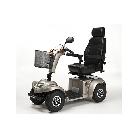 M4BE moped bordó színben. Használata olyan betegek számára ajánlott, akik nem képesek önállóan nagyobb távolságot megtenni. Méretének köszönhetően egyaránt alkalmas beltéri is kültéri használatra, segítségével használója jóval nagyobb távolságot tehet