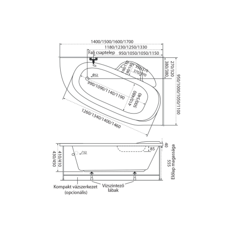 M-Acryl Daria aszimmetrikus akril kád 140x95 jobbos kád, zuhanykabin árgrafikon