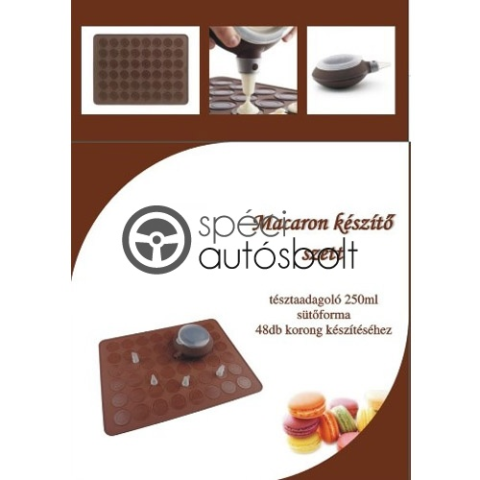 A macaron sütő készlet egy darab 48 darab korongot tartalmazó 1 db szilikon sütőlapot + 1 db adagolót + 1 db kupakot