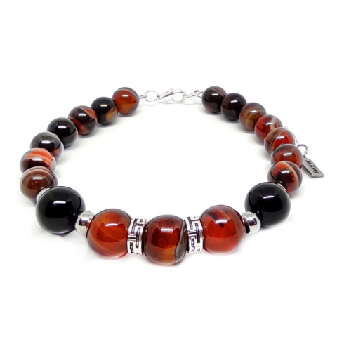 Figyelem! Nem szakad, nem nyúlik! Tartós ékszer. Az ékszer ásványai és tartozékai: – 10 mm-es és 8 mm-es csíkos Ónix/Achát ásványok – 10 mm-es fekete Ametiszt ásványok – Nemesacél díszítő elemek – M.King márkajelzésű nemesac