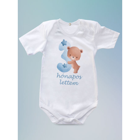 Baba ajándék, macis body kisfiúknak, 3 hónapos lettem body. A 3 hónapos mérföldkő megörökítéséhez ez a meglepetés body ideális választás.Fehér, rövid ujjú, patentos, 100% pamut body, mely a kisbaba kényelmét és a szülők örömét is szolgálja.Szívmelengető a