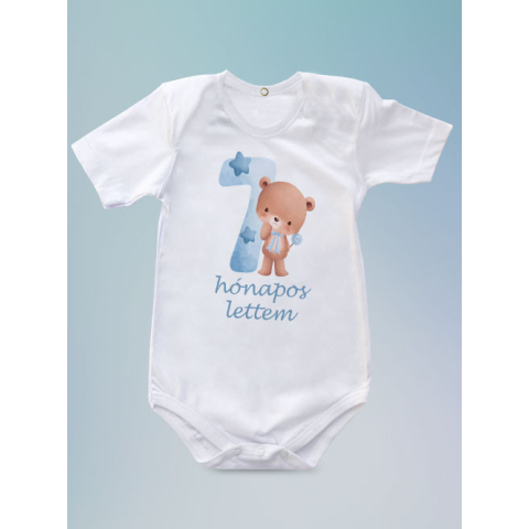 Baba ajándék, macis body kisfiúknak, 7 hónapos lettem body. Medvés body minden 7 hónapos baba ruhatárából kihagyhatatlan!Fehér színű, 100% pamut, rövid ujjú és patentos – praktikus, kényelmes és aranyos.Ajándékként vagy meglepetésként is tökéletes, ha val