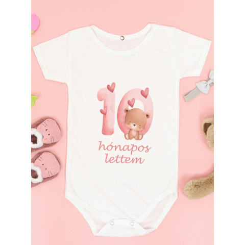 Baba ajándék, macis body kislánynak, 10 hónapos lettem body. Már csak kettő van hátra az első szülinapig! Ezt a cuki, szívvel teli macis bodyt pont erre az alkalomra terveztük. Tökéletes egyedi ajándék és szuper emlék a családi fotóalbumba. Fehér, rövid u