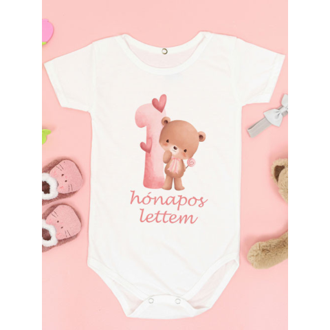 Baba ajándék, macis body kislánynak. Tedd emlékezetessé a kisbabád első hónapját ezzel az aranyos, szívvel díszített macis bodyval! A 1 hónapos lettem feliratú darab tökéletes egyedi ajándék babalátogatásra vagy havi fotózáshoz. Kiváló minőségű, fehér, rö