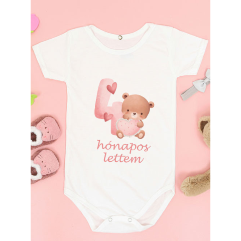 Baba ajándék, macis body kislánynak, 4 hónapos lettem body. Meglepetés, amit minden szülő és nagyszülő imádni fog! Ez a 4 hónapos felirattal ellátott body szívecskés macival tökéletes egyedi ajándék bármilyen alkalomra. Legyen szó fotózásról, babanapló ké