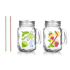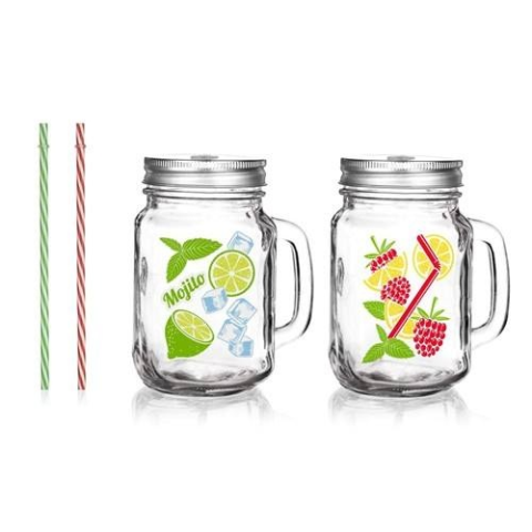 450 mi-es füles üvegtároló lemeztetővel, dizájnos befőttesüveg tető, szívószál nyílás, tároló magassága 13,5 cm, különböző díszítések.