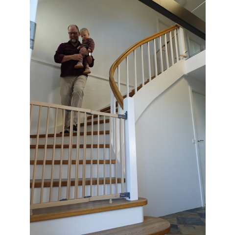 A forgatható tartók lehetővé teszik a rács ferdén történő felszerelését - könnyen alkalmazkodik a ferde falakhoz. A rács extra magas, 80,5 cm-es , és robusztus védelmet nyújt Az intuitív egykezes működtető mechanizmus megkönnyíti a felnőttek hozzáférését, miközben biztosítja a gyermekek biztonságát, akik nem nyitják ki. Az állítható szélesség lehetővé teszi, hogy bármilyen 70,5-110 cm széles nyílásba illeszkedjen, ha a nyílásba/ajtókeretbe van sz