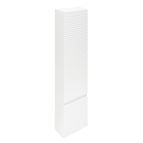 Fényes fehér színű, falra szerelhető fürdőszobai szekrény. 40,2x157x21,7 cm méretű fényes felülettel. Laminált felület.