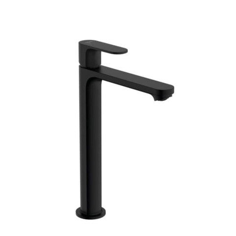 Karral álló magas mosdó csaptelep leeresztőszeleppel fekete matt kivitelben. A csaptelep térfogatárama 3,5 liter / perc. A csaptelep magassága 30,3 cm. A kar 24,2 cm magasan van. Matt felülettel.