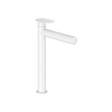 Karral álló magas mosdó csaptelep kiömlőnyílás nélkül fehér színben A csaptelep térfogatárama 4,5 liter / perc. A csaptelep magassága 31,6 cm. A kar 24,9 cm magasan van. Matt felülettel