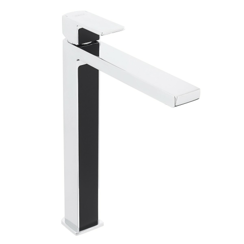 Karral állványos magas mosdó csaptelep leeresztőszelep nélkül. Fekete színben krómmal kombinálva. A csaptelep térfogatárama 4,5 liter / perc.
