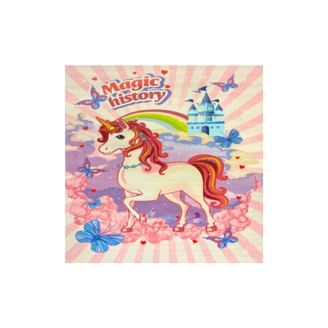 Magic unicorn gyerekszőnyeg 133x180cmA Magic Unicorn gyerekszőnyeg egy varázslatos kiegészítő minden kisgyermek szobájába! Színes, álomszerű egyszarvús mintája és a „Magic History” felirat egy mesés világba repíti a kicsiket, ahol a képzelet határtalan. A pillangók, szivárvány és kastély motívumok vidám hangulatot és fantáziát ébresztenek, miközben a szőnyeg kellemes és biztonságos játékfelületet biztosít.A csúszásgátló hátoldal gondoskodik arról,