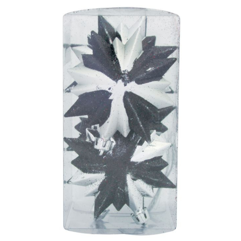 A karácsonyfa díszkészlet a karácsonyfa ünnepi díszítésére szolgál. 6 db 8 x 9,5 cm méretu díszbol áll. A díszek színe fekete-ezüst.