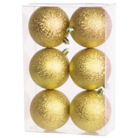 A karácsonyfa díszkészlet a karácsonyfa ünnepi díszítésére szolgál. 6 db 8 cm átméroju darabból álló karácsonyi gömbbol áll. A gömbök színe arany. Muanyagból készült.
