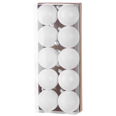 A karácsonyfa díszkészlet a karácsonyfa ünnepi díszítésére szolgál. 10 db 6 cm átméroju darabból álló karácsonyi gömbbol áll. A gömbök színe fehér. Muanyagból készült.